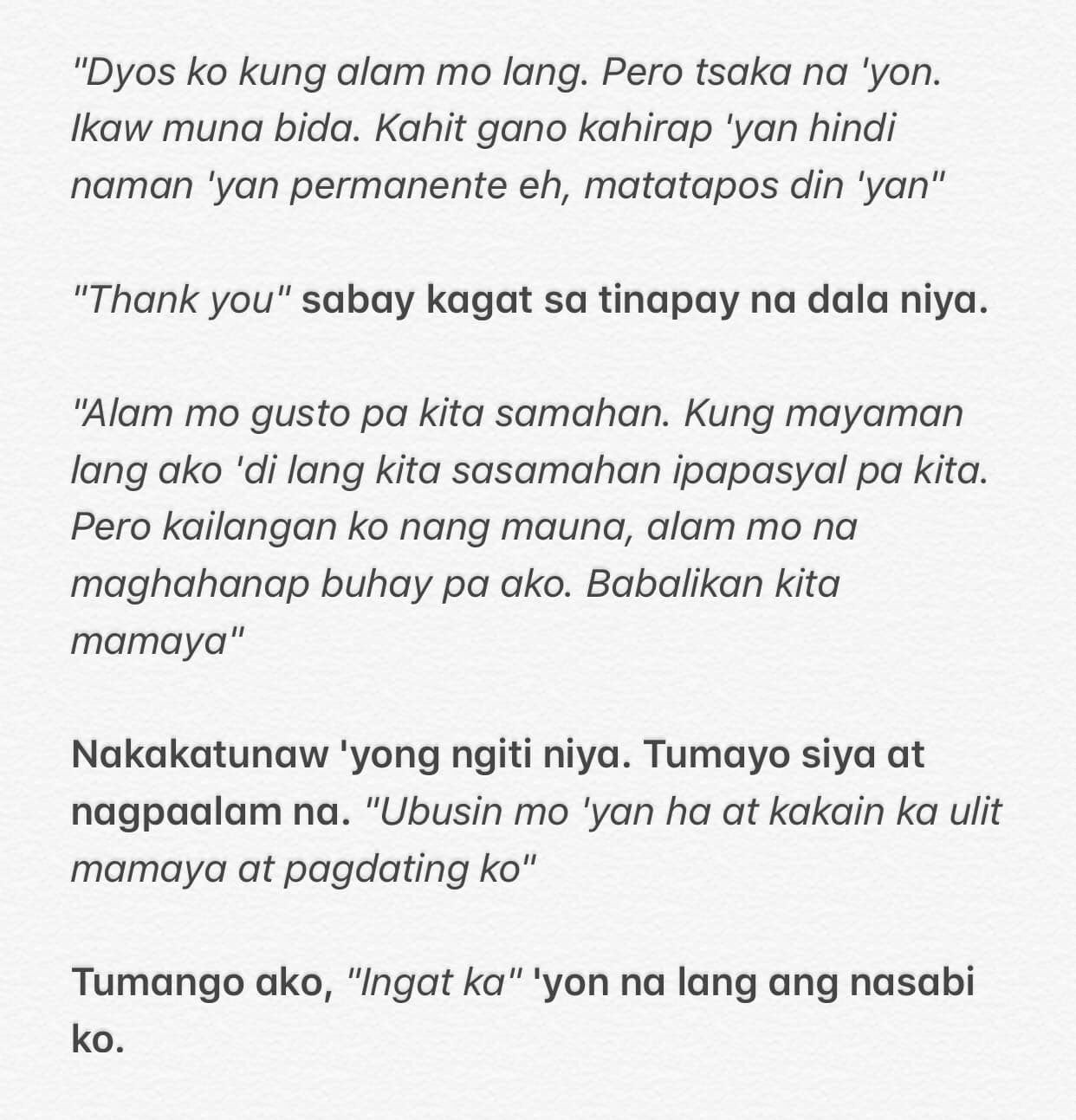 Tinuring ka naming parte ng pamilya tapos gagaguhin mo lang pala yung kapatid ko. Yung inorder mo nung first date natin yon pa din inoorder ko. Nadinig ko yan sinabi ng friend ko sa isa pa naming friend.